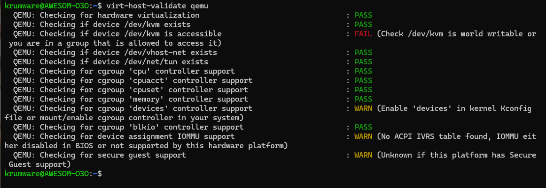 QEMU: Checking if device /dev/kvm exists : FAIL (Check that the 'kvm-intel' or 'kvm-amd' modules are loaded & the BIOS has enabled virtualization)