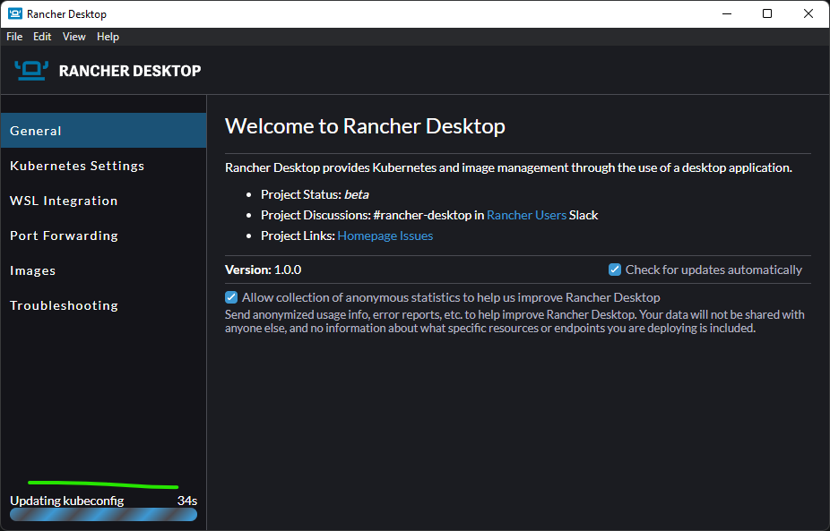 5. Wait for the Rancher Desktop to initialize for the first time