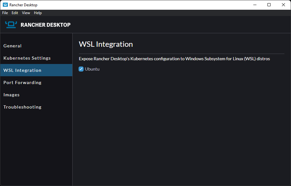 7. Check the box next to your chosen distribution, and Rancher Desktop will install the appropriate links with the WSL instance. Once complete, the checkbox will persist.